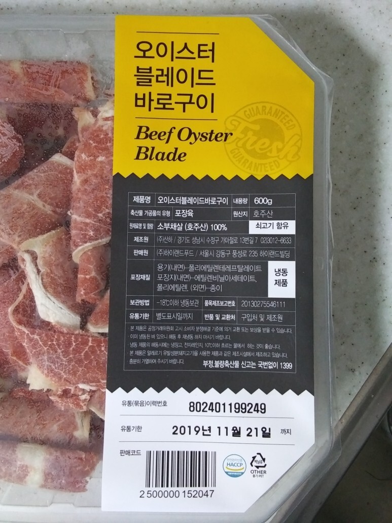 이런 구이용 냉동육들이 꽤 다양한 종류가 있는데, 이 오이스터 블레이드 바로구이랑 우삼겹, 대패 삼겹살, 대패 목살 등을 다 번갈아가며 사다먹는 편이다.