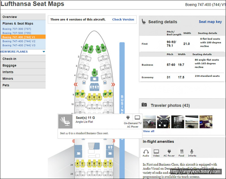 대형 비행기는 데크가 여러개일 수 있는데 모든 데크를 다 보여준다. 각각의 좌석 아이콘 위에 마우스를 올리면 상세 정보가 뜬다. 오른쪽 편에 더 많은 정보들이 있는데, 실제 여행자들이 찍어 올린 사진들도 제공한다. 각 좌석을 색깔로 구분해서 좋은 자리인지 나쁜 자리인지를 표시해 두었다.