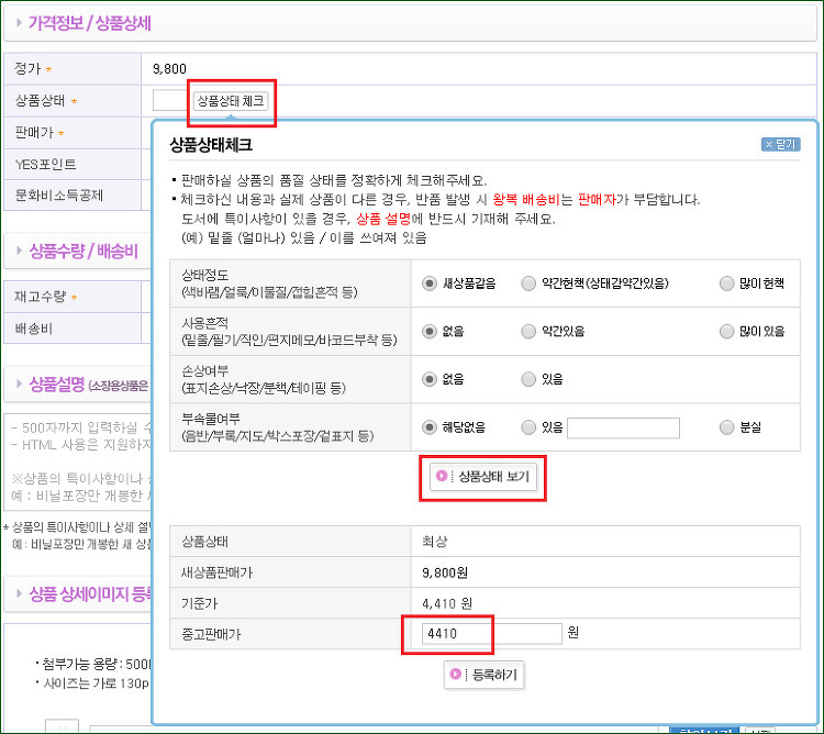 [상품상태 체크] 버튼을 눌러서 책의 상태를 설정해 주면 되는데, 책의 상태를 설정하는 순간 아래 그림에서처럼 적당한 판매가를 제시해 준다.