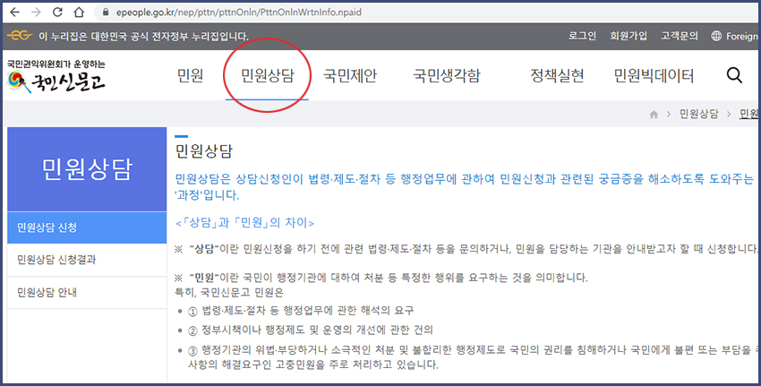 국민신문고 사이트에서 "상담"과 "민원"의 차이점