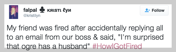 내 친구는 해고됐다 / 실수로 전체에게 답장한 후에 / 사장에게서 온 이메일에 /