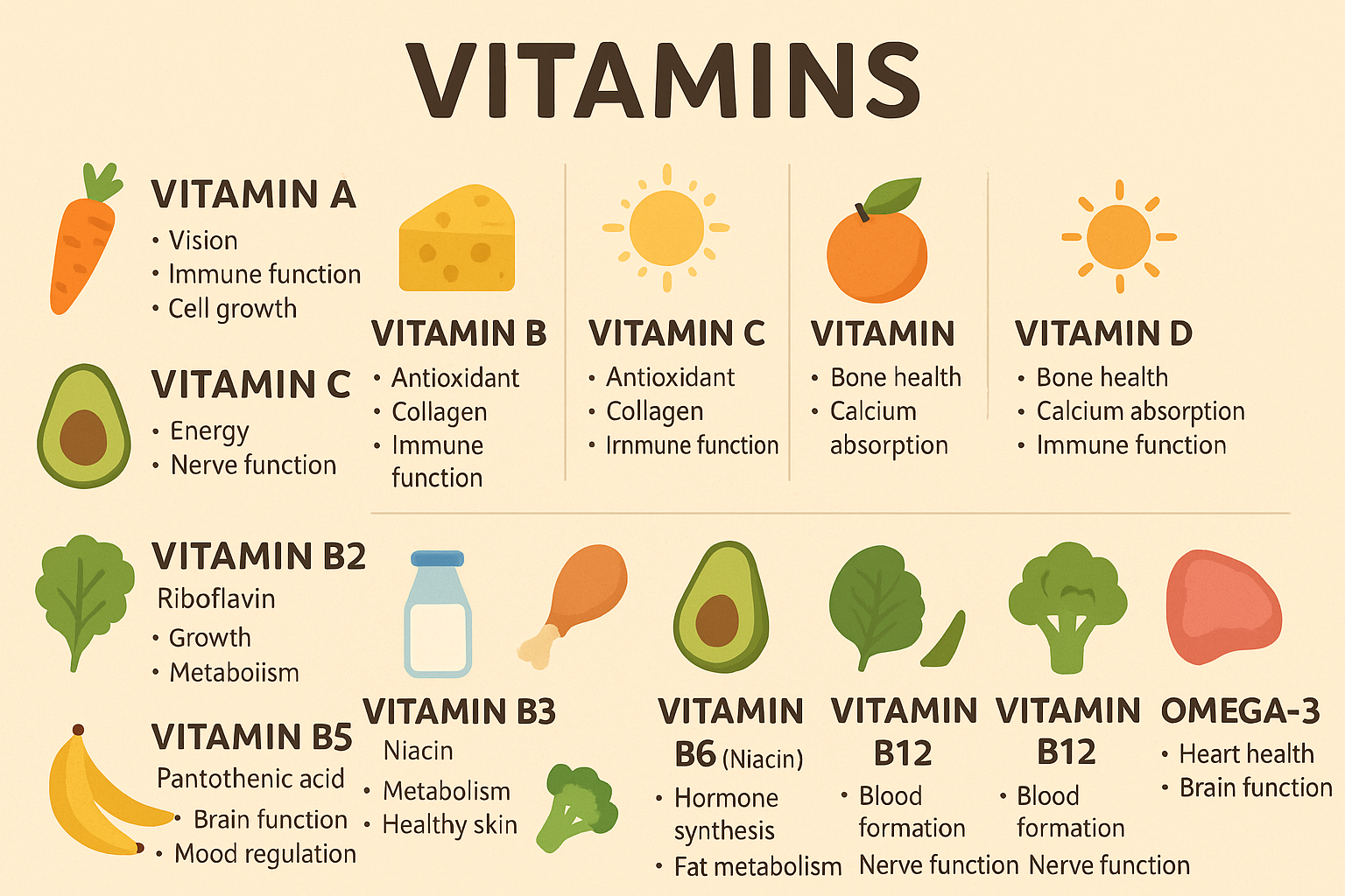 비타민 B 기능 : 에너지 대사, 신경 기능, 적혈구 생성, 세포 성장 등