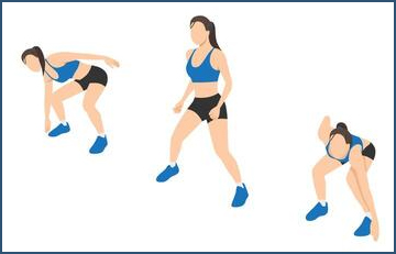 무릎을 살짝 굽히고 상체를 낮춘 자세를 유지한 채, 발을 교차하지 않고 빠르게 좌우로 이동. 측면 민첩성과 반응 속도를 향상시키는 전신 유산소 동작.