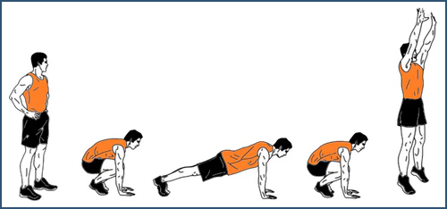 서서 시작해서 스쿼트로 내려갔다가 손을 바닥에 짚고 두 발을 뒤로 뻥 차 플랭크로 뻗은 뒤, 다시 다리를 모아 일어서며 점프로 올라오는 흐름을 한 동작처럼 연속 반복하는 전신 유산소/근지구력 운동.