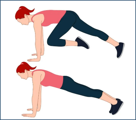 팔로 바닥을 짚고 플랭크 자세에서, 한쪽 무릎씩 번갈아 가슴 쪽으로 빠르게 끌어당기는 동작을 연속으로 이어간다.