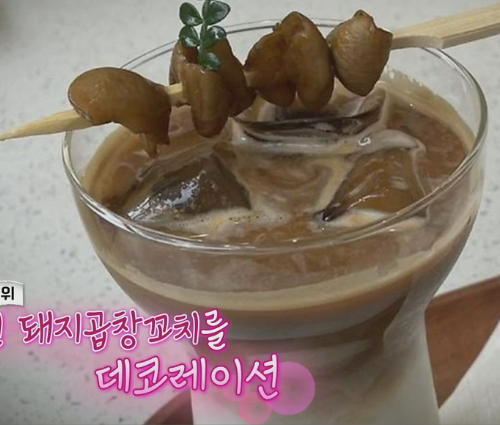 2025년 중국 쓰촨성 장유시 L카페에서 출시한 괴식(중국이 중국했네)으로, 카페 라떼 위에 조린 돼지곱창 꼬치를 데코레이션으로 얹은 음료.