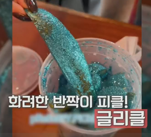 SNS 인스타 영상 조회수 2,160만회 돌파, 78만건 이상 공유되며 대 화제가 된 메뉴. 피자 먹고 느끼할 땐 이렇게 먹자. 반짝이 글리터+피클(Glitter+Pickle)을 섞은 일명 반짝이 피클 "글리클"