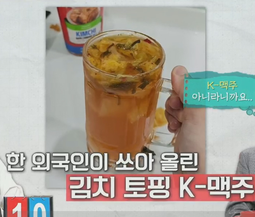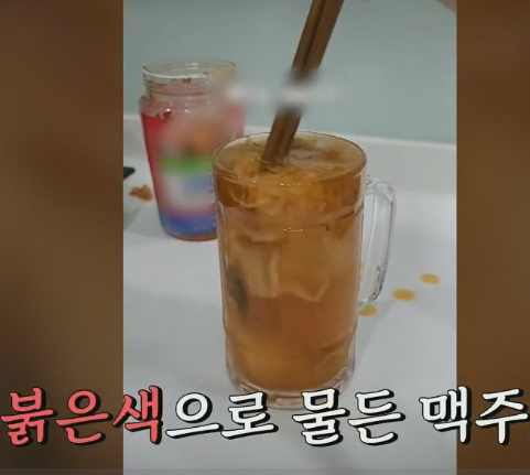 한국인들은 경악할 맥주 비주얼인데, 김치를 맥주에 풍덩 넣고 휘저으면 노란 맥주가 어느새 붉게 물들고 보기만해도 충격적인 비주얼의 K-맥주.