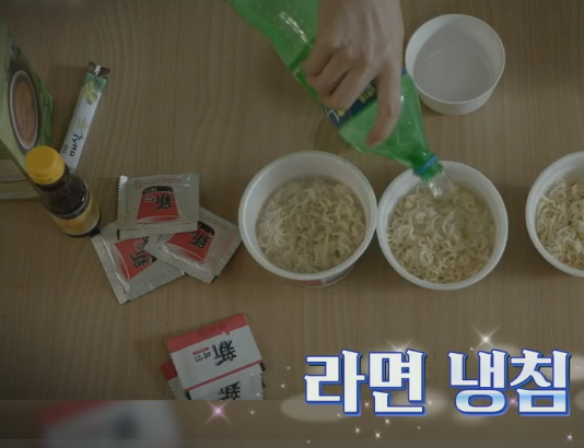 이게 끝이 아니고, 일명 "라면 냉침"이 있는데, 컵라면을 뜯어 찬 사이다를 넣고 30분간 불려준다. 소스를 만드는데, 사이다 약간에 매실청, 참기름, 라면 스프를 넣고 섞어 준다. 이 소스를 컵라면에 넣어 비빔면처럼 비벼먹는 스타일의 라면 레시피.