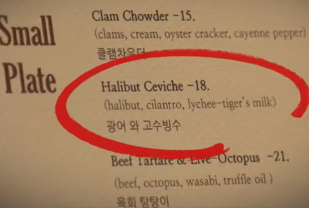 왜 굳이 고수와 광어로 빙수를 만들어먹어야 하나 의아할 수 있지만, 생선과 레몬, 라임소스를 마리네이드 해 먹는 중남미의 대표 요리인 "세비체"에서 영감을 얻은 에피타이저 메뉴.