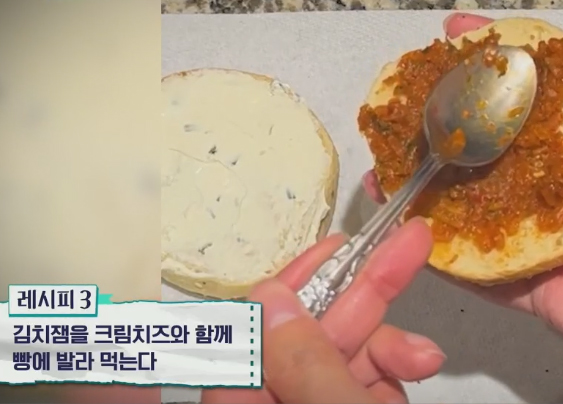 3) 김치잼과 크림치즈를 빵에 발라 먹는다