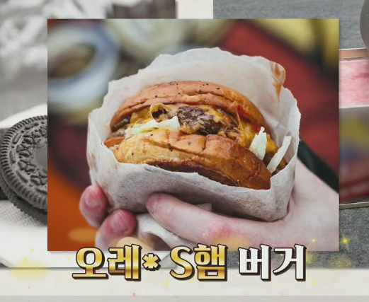 고기 패티 대신 스팸 2장, 양상추 토마토 양파 등의 채소 토핑 대신 달달한 오레오 과자를 넣음.