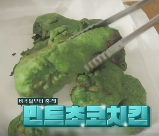 레시피는, 치킨 반죽에 민트를 넣어 일반 치킨처럼 튀기고, 토핑으로 초콜릿을 듬뿍 뿌리면 됨.