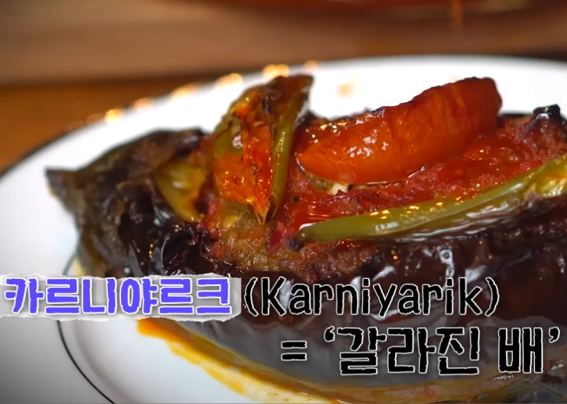 카르니야르크(Karniyarik) 뜻 = '갈라진 배' 라는 의미로 대략의 레시피는, 가지를 통째로 익힌 후, 다진 고기로 만든 속 재료들을 골고루 잘 섞어서 가지 속을 꽉 채워 오븐이나 팬에서 익히는 방식. 포인트는 겉바속촉을 유지하는 것.
